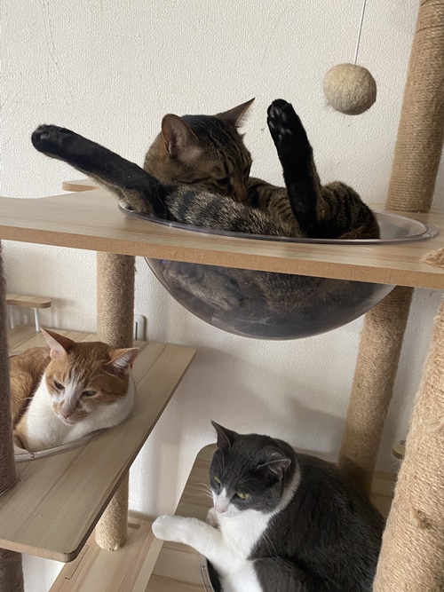 猫たちはみんな元気です。遊びながらおやつの出る【でるでる】の練習をしています。