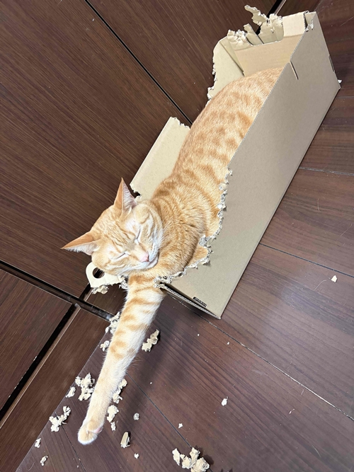 猫たちはみんな元気です。ゴールデンウィークに箕面市パナソニックの住宅機器展示場で猫の譲渡会が行われていました。能登の震災で被害にあった猫たちの展示やたくさんの譲渡待ちの猫たちがいました。初めての譲渡会参加で、多くの参加者が来られており驚きました。自宅の猫には、シカの皮で製作された猫じゃらしをお土産で買いました。