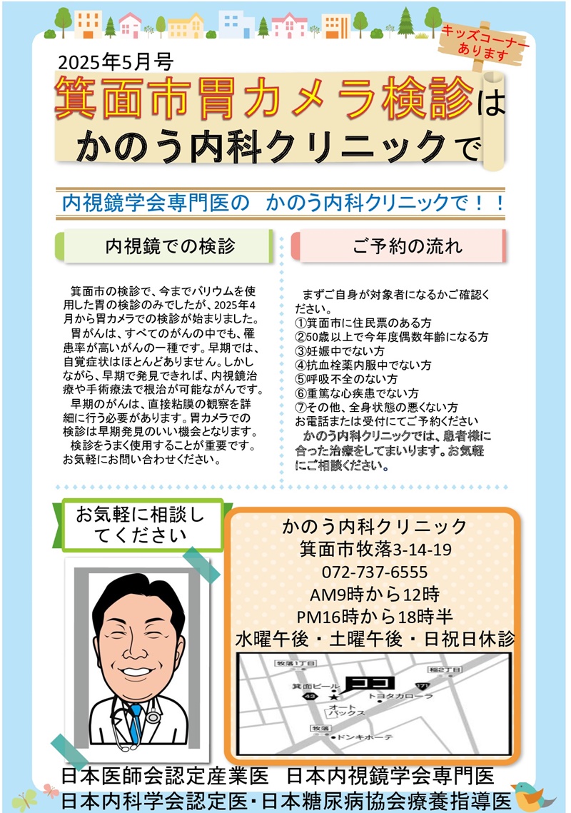 箕面市の検診で、2025年4月から、胃内視鏡(胃カメラ)での胃がん検診が開始されました。50歳以上になられる箕面市民で偶数年齢の方が対象です。同日に特定検診・肺がん検診・大腸がん検診・前立腺がん検診の検査が可能となっております。お気軽にお問い合わせください。